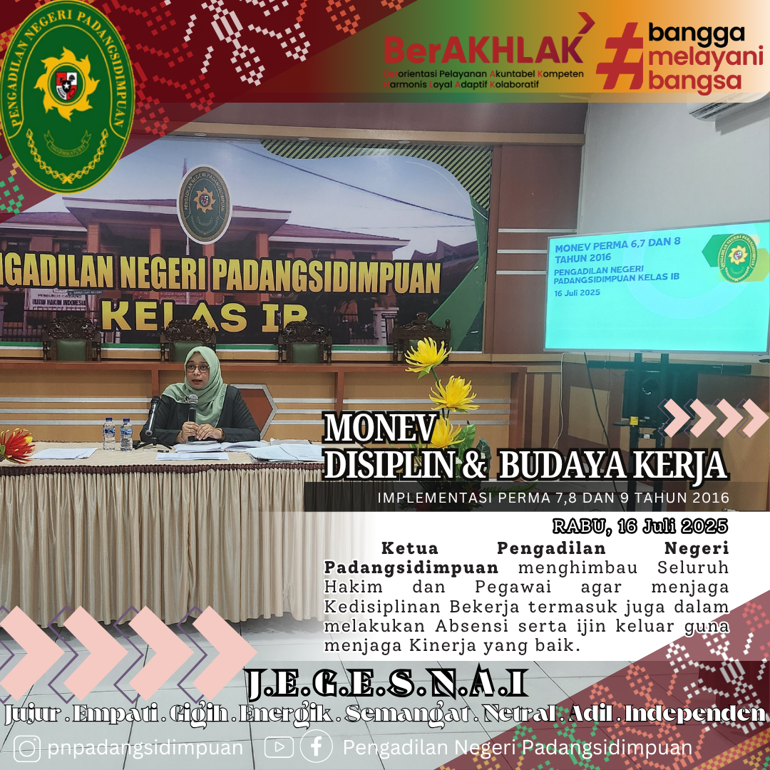 Padangsidimpuan, Rabu( 16/7/2025)-Pelaksanaan Rapat Monitoring dan Evaluasi Disiplin kerja dan budaya kerja yang dipimpin oleh Ketua Pengadilan Negeri Padangsidimpuan Ibu Silvianingsih, S.H., M.H.