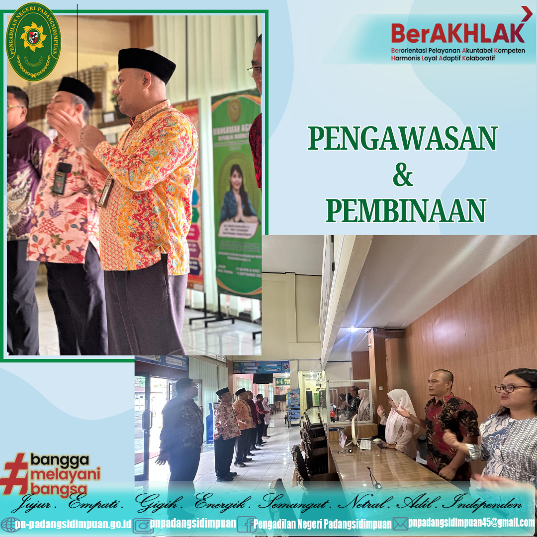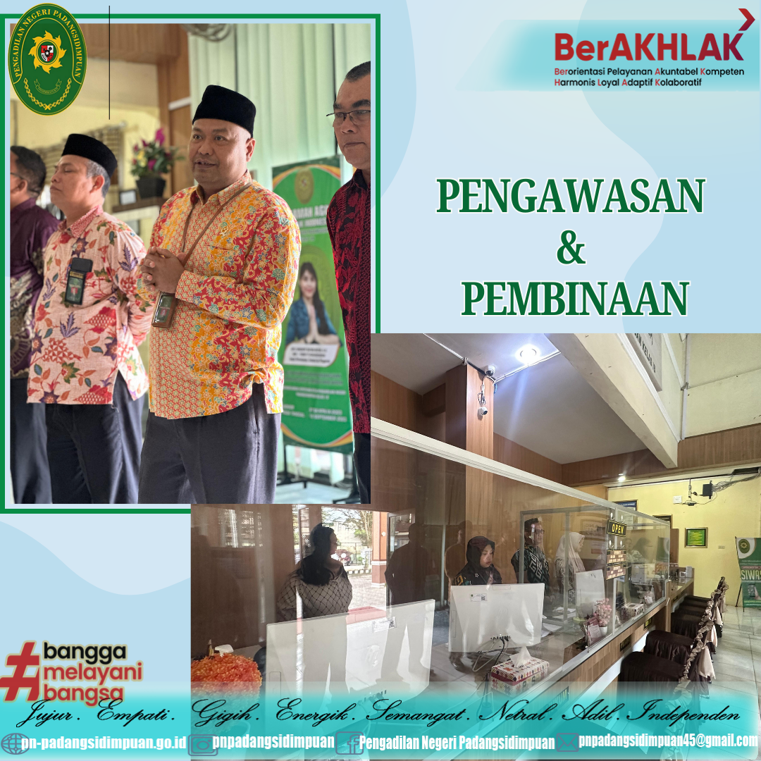 Telah dilaksanakan Pembinaan dan Pengawasan Rutin yang dilakukan oleh Ketua Pengadilan Negeri Padangsidimpuan, Panitera, Sekretaris Beserta Panitera Muda dan Kasubbag Pengadilan Negeri Padangsidimpuan di PTSP PN Padangsidimpuan Kelas IB.