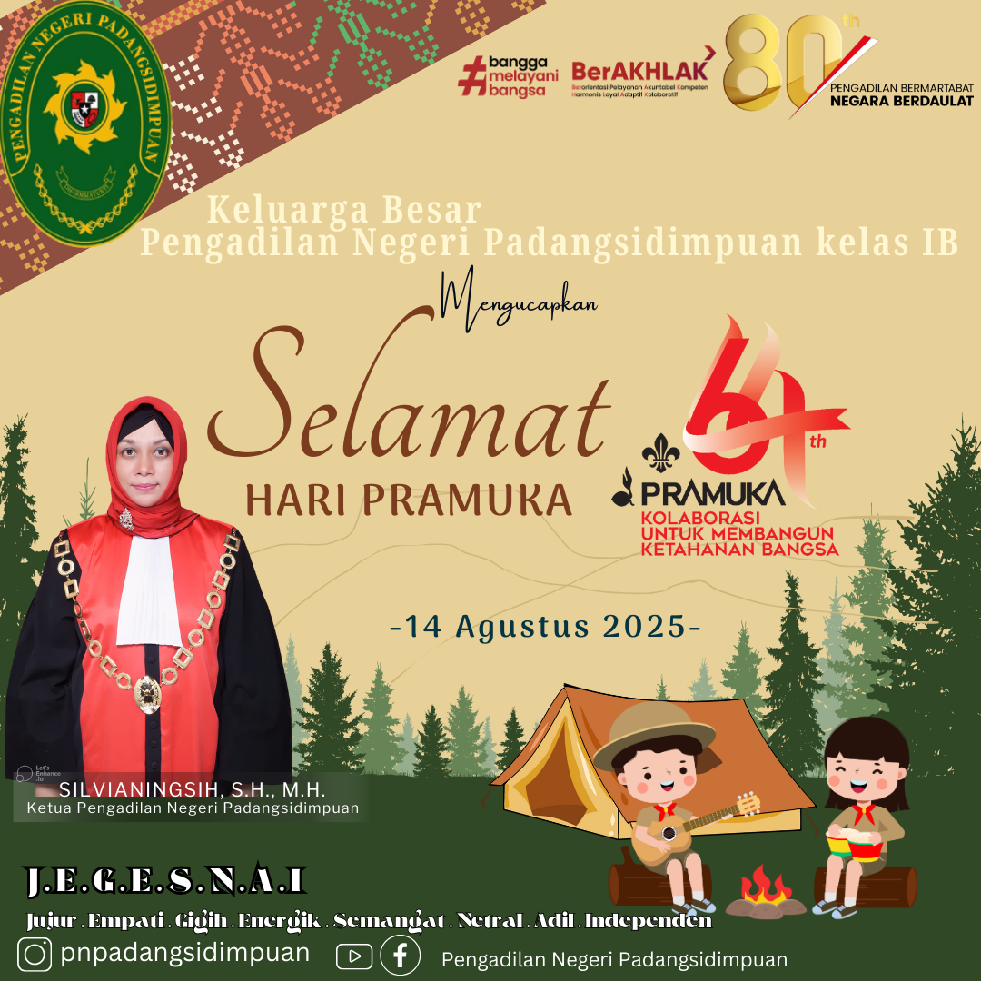 Keluarga Besar Pengadilan Negeri Padangsidimpuan Mengucapkan "Selamat Hari Pramuka 2025. dengan Tema "Kolaborasi untuk Membangun Ketahanan Bangsa" Semoga Pramuka terus lahirkan tunas-tunas muda yang selalu terdepan dalam berikan solusi bangsa, serta menghadirkan kemajuan baru. Salam Pramuka!"