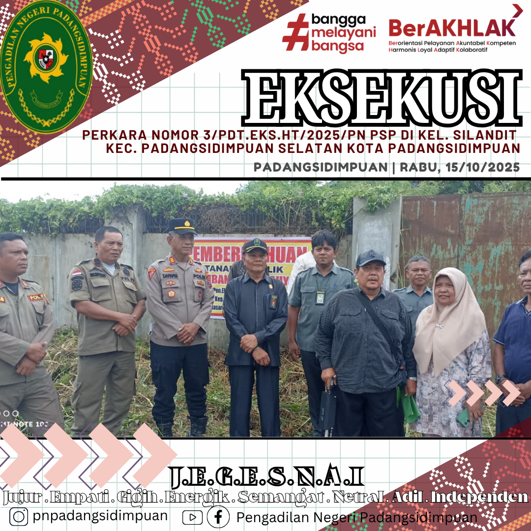 Padangsidimpuan, Rabu(15/10/2025)-Pelaksanaan Eksekusi Perkara permohonan eksekusi Nomor 3/Pdt.Eks.HT/2025/PN Psp. Eksekusi Berhasil dilaksanakan dengan baik, lancar dan terkendali.